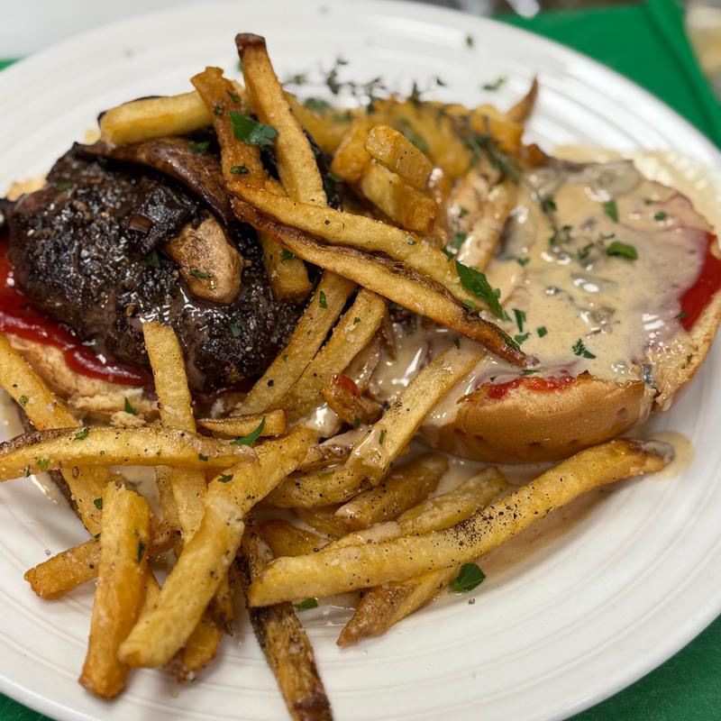 open faced with mushrooms & Gruyere cream, pommes frites